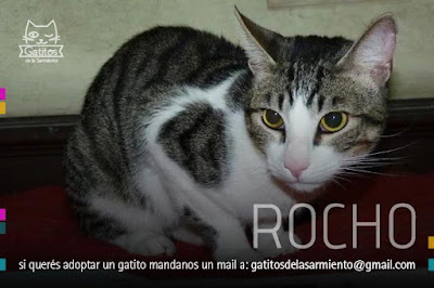 Rocho es un gatito joven, de ojos enormes, muy charlatán y curioso. Es travieso, movedizo, simpático y mimoso (cuando él quiere). Tiene toda la actitud y una energía contagiosa. Le gusta pasear, investigar y jugar. Es un loco atlético y glotón. Es un fenómeno pero necesita paciencia y buena onda.